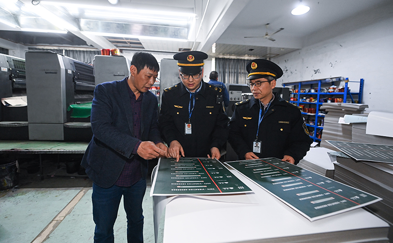 浙江诸暨市文化市场行政执法队的工作人员在检查印刷企业印刷品内容是否规范(2023年4月7日摄)。今年以来,诸暨市持续开展“净化文化市场 护航杭州亚运”主题系列宣传活动与专项执法检查行动,重点打击侵害知识产权、危害未成年人身心健康等文化市场违法行为。新华社记者 徐昱 摄