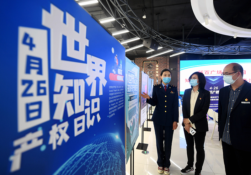 河北石家庄市桥西区市场监督管理局工作人员为市民普及知识产权知识(2021年4月26日摄)。新华社记者 王晓 摄